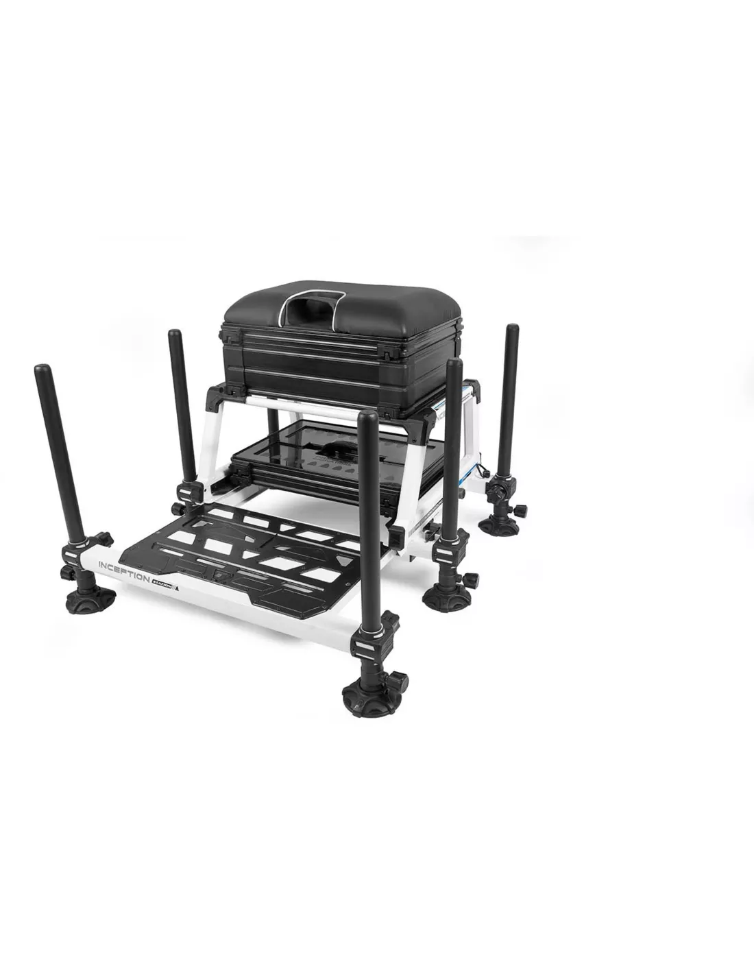 De cassette onder het frame wordt geleverd met een 26 mm lade en deksel, indien nodig kunnen hier extra laden aan toegevoegd worden. De zitkist wordt geleverd met zes telescopische poten, waardoor een nauwkeurige afstelling op de oever geen probleem is.